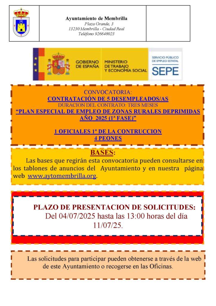 Bases para la selección para la contratación de trabajadores dentro del personal laboral temporal del ayuntamiento de Membrilla, con duración temporal, para las obras incluidas en la memoria del plan especial de empleo de la Excma. Diputación provincial de Ciudad Real para el año 2025.