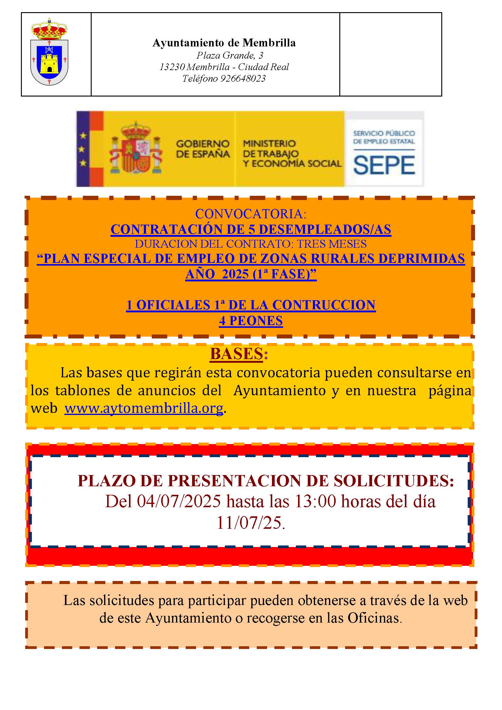 Bases para la selección para la contratación de trabajadores dentro del personal laboral temporal del Ayuntamiento de Membrilla, con duración temporal, para las obras de “conservación y desarrollo del patrimonio forestal y el medio ambiente” incluidas en el proyecto enmarcado dentro del plan especial de empleo de zonas rurales deprimidas año 2025.